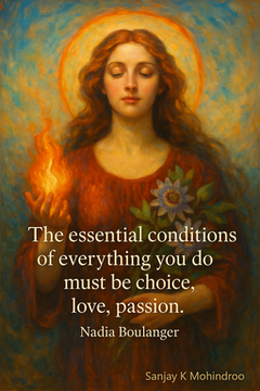 There is a quote by Nadia Boulanger that hits hard: “The essential conditions of everything you do must be choice, love, passion.” It holds a simple point. If your work feels forced, empty, or dull, you feel it. When you choose with intent, bring care to what you do, and push with real drive, you change the tone of your life and your work. That is the core message behind the quote. It speaks with calm strength and warm depth.
