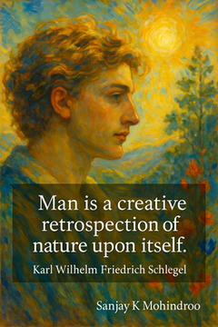 “Man is a creative retrospection of nature upon itself.” That line holds a mirror up to us all. It suggests that human beings are not separate from nature but are its way of observing, shaping, and admiring its own creation. #Philosophy #Nature #Creativity